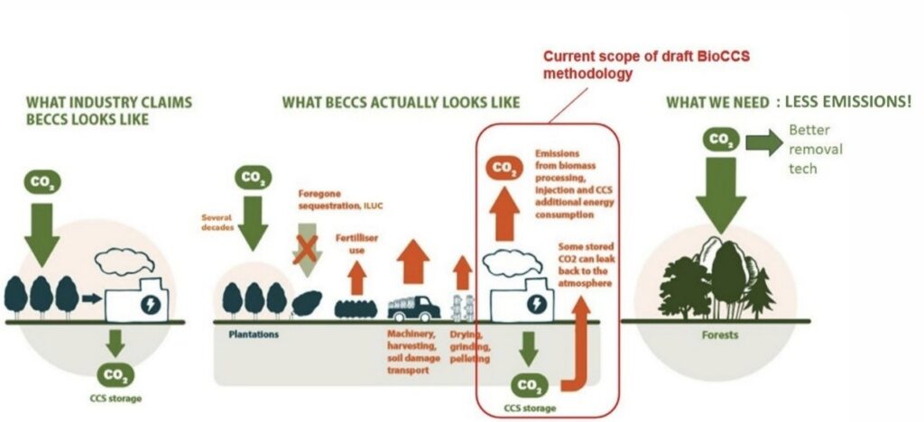 Beide vormen van koolstofverwijdering hebben grote nadelen en zijn daarmee loze beloften. BECCS levert geen negatieve CO2-emissies op. In de keten vinden diverse CO2-verliezen plaats die vreemdgenoeg niet worden meegerekend. Vooraan in de BECCS-keten vinden bij houtoogst (bodemoxydatie), fabricage van houtpellets en (overzees) transport) emissies plaats. Ook niet alle CO2 bij de houtverbranding wordt afgevangen. Het rendement van afvang van CO2 bedraagt slechts 80%. 20% gaat de atmosfeer in. De CO2-afvang en opslag (CCS) vergt veel energie (lees CO2-uitstoot). Ongeveer 30% van de energie die bij biomassaverbranding wordt opgewekt, is nodig voor CCS. De eerste pilots van CO2 opslag in Noorwegen (Noorse opslaglocaties Sleipner en Snøhvit[2]) laten een risico op lekkage na opslag zien. Kortom, BECCS garandeert op geen enkele manier een negatieve CO2-uitstoot over de gehele keten.[3]